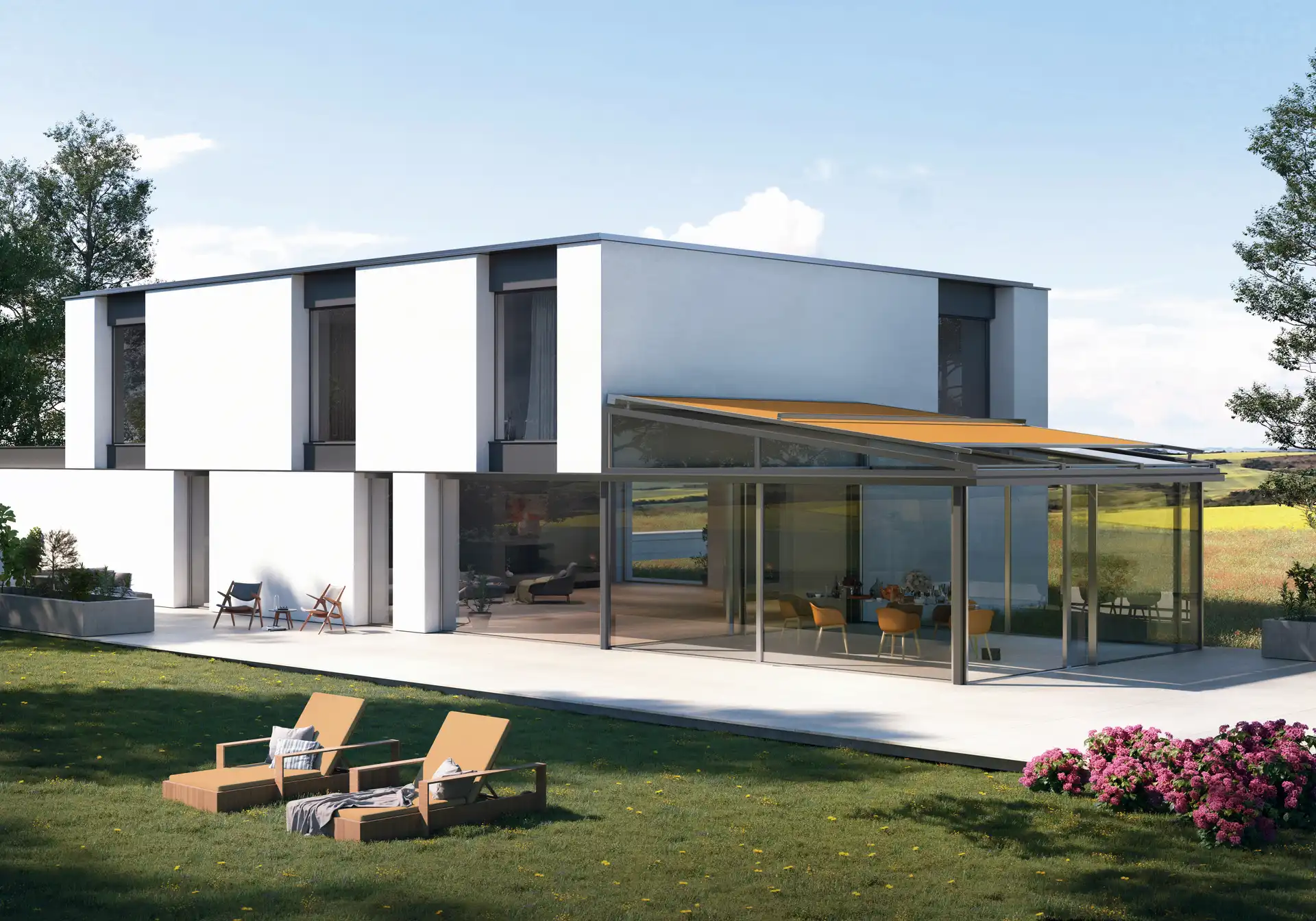 Mit dieser außenliegenden Wintergarten-Markise können Sie im Sommer die Hitze wirksam draußen halten, während Sie sich im Winter von wärmenden Sonnenstrahlen verwöhnen lassen können. Durch die innovative secudrive®-Führung entsteht kein Lichteinfall zwischen Markisentuch und Führungsschiene und eine hohe Windstabilität ist garantiert. Optional auch mit eckigem Blendensystem erhältlich.